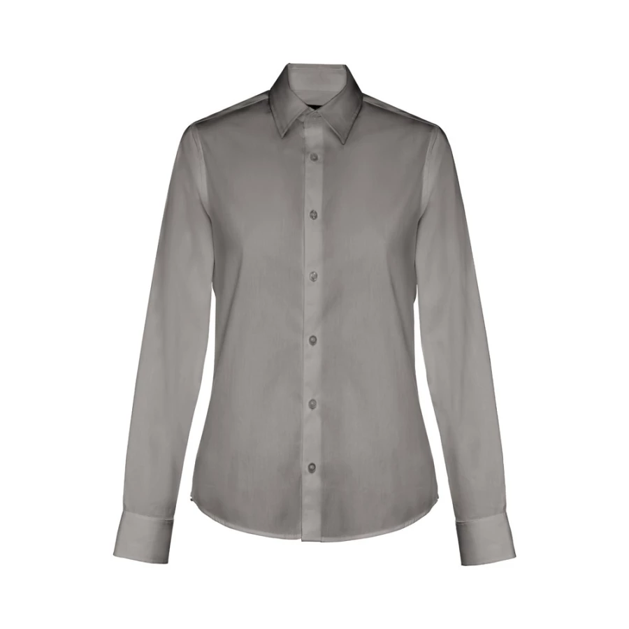 Damska koszula z długim rękawem. 68% bawełna, 28% poliamid i 4% elastan (115 g/m²). Długi rękaw z 1 zakładką i regulowanymi mankietami z 1 guzikiem. Dopasowana talia z 2 zaszewkami z tyłu i zapięciem na 7 pasujących kolorystycznie guzików. Rozmiary: S, M, L, XL, XXL