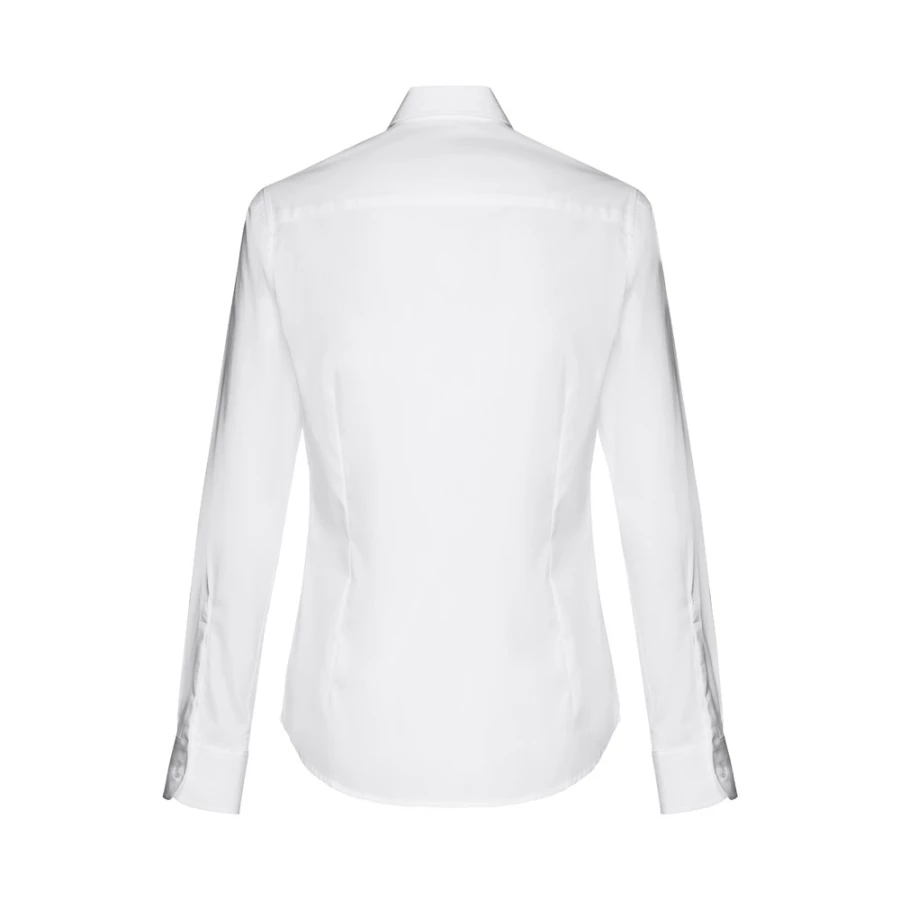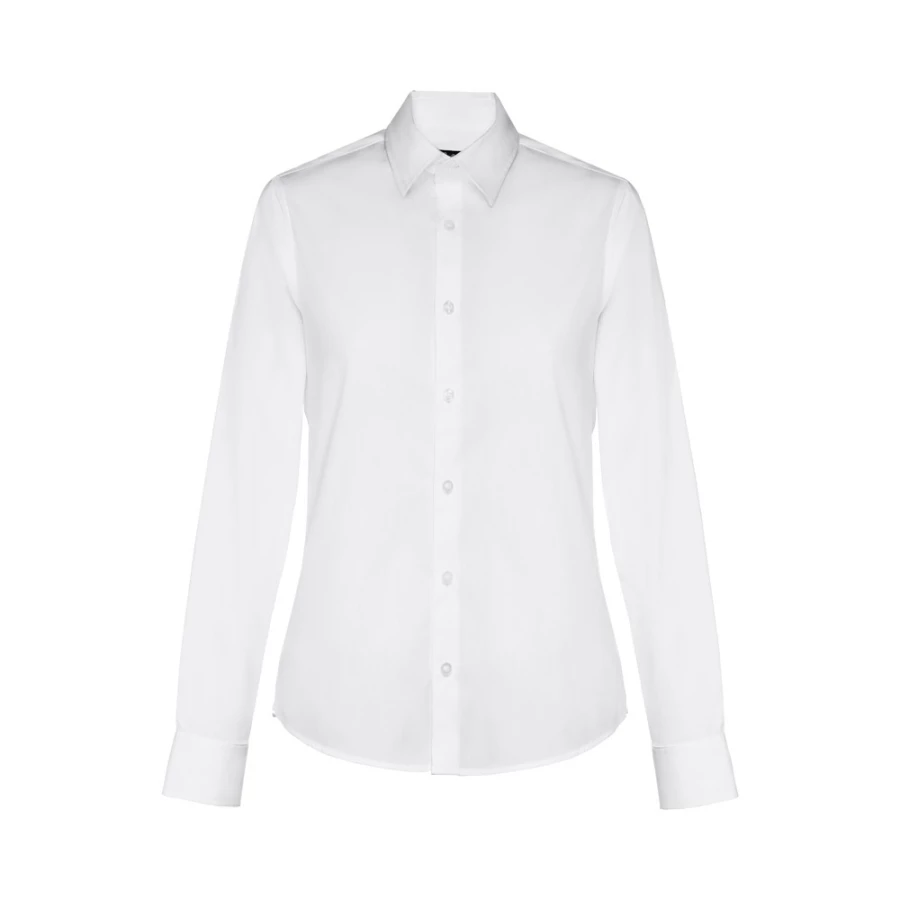 Damska koszula z długim rękawem. 68% bawełna, 28% poliamid i 4% elastan (115 g/m²). Długi rękaw z 1 zakładką i regulowanymi mankietami z 1 guzikiem. Dopasowana talia z 2 zaszewkami z tyłu i zapięciem na 7 pasujących kolorystycznie guzików. Rozmiary: S, M, L, XL, XXL