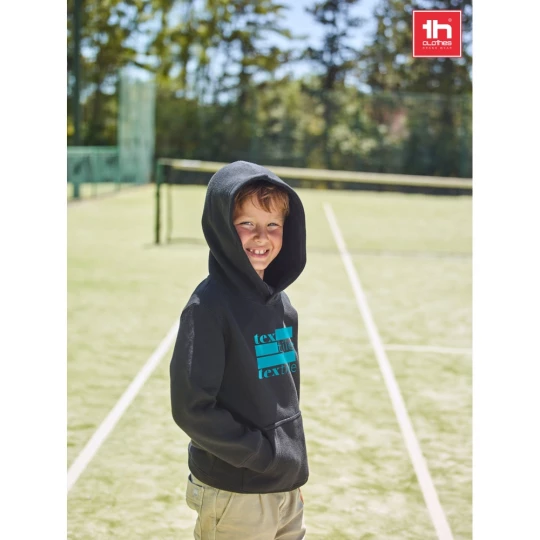 Dziecięca bluza z kapturem (unisex) z 50% bawełny i 50% poliestru (320 g/m²), zgrzebne wnętrze. Kaptur z dżersejową podszewką, spełniający normy bezpieczeństwa Unii Europejskiej. Kieszeń typu kangurek i ściągacze 1x1 w mankietach i pasie. Rozmiary: 2, 4, 6, 8, 10, 12