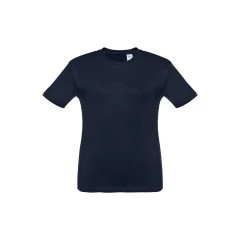 T-shirt dziecięcy (unisex) ze 100% bawełnianego dżerseju zgrzebnego (150 g/m²). Posiada 1x1 prążkowany kołnierzyk ze wzmacniającą tasiemką dżersejową. Zszywany po bokach, z podwójnym ściegiem na rękawach i na dole. Rozmiary: 2, 4, 6, 8, 10, 12