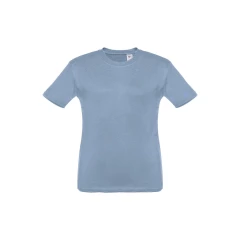T-shirt dziecięcy (unisex) ze 100% bawełnianego dżerseju zgrzebnego (150 g/m²). Posiada 1x1 prążkowany kołnierzyk ze wzmacniającą tasiemką dżersejową. Zszywany po bokach, z podwójnym ściegiem na rękawach i na dole. Rozmiary: 2, 4, 6, 8, 10, 12