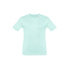 T-shirt dziecięcy (unisex) ze 100% bawełnianego dżerseju zgrzebnego (150 g/m²). Posiada 1x1 prążkowany kołnierzyk ze wzmacniającą tasiemką dżersejową. Zszywany po bokach, z podwójnym ściegiem na rękawach i na dole. Rozmiary: 2, 4, 6, 8, 10, 12