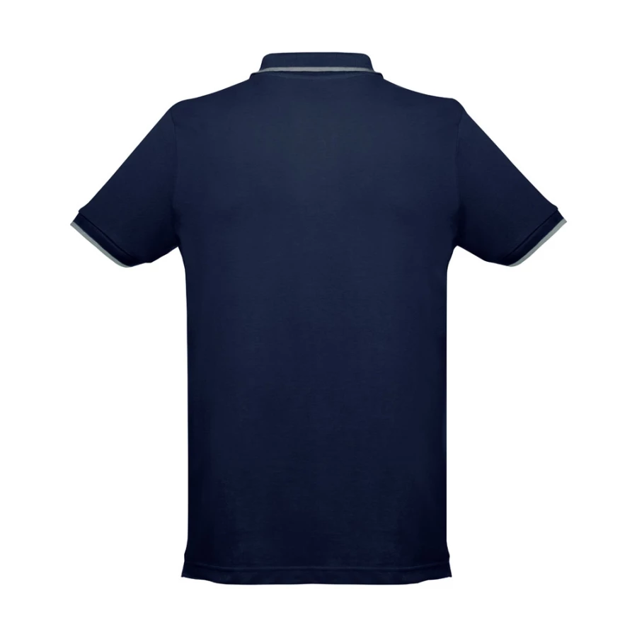 Męska dwukolorowa koszulka polo z krótkim rękawem, wykonana w 100% z bawełny zgrzebnej typu pique (210 g/m²) (kolor 183: 85% bawełna/15% wiskoza). Dwukolorowy kontrast na kołnierzu, rękawie i plisie. Posiada prążkowane mankiety i kołnierz. Wzmocniona plisa z 3 kontrastującymi kolorami guzików (dodatkowy guzik umieszczony w wewnętrznym szwie bocznym). Dopasowana talia i małe boczne rozcięcia na dole. Rozmiary: S, M, L, XL, XXL