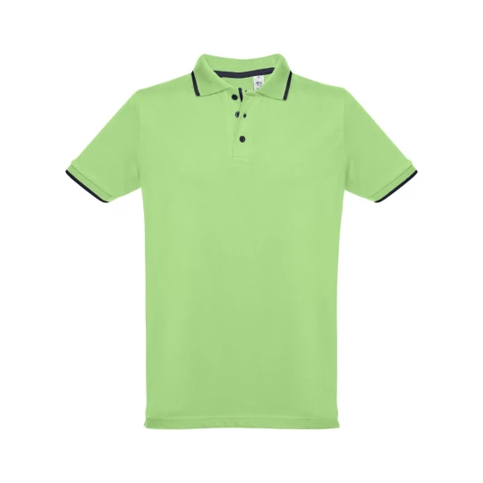 Męska dwukolorowa koszulka polo z krótkim rękawem, wykonana w 100% z bawełny zgrzebnej typu pique (210 g/m²) (kolor 183: 85% bawełna/15% wiskoza). Dwukolorowy kontrast na kołnierzu, rękawie i plisie. Posiada prążkowane mankiety i kołnierz. Wzmocniona plisa z 3 kontrastującymi kolorami guzików (dodatkowy guzik umieszczony w wewnętrznym szwie bocznym). Dopasowana talia i małe boczne rozcięcia na dole. Rozmiary: S, M, L, XL, XXL