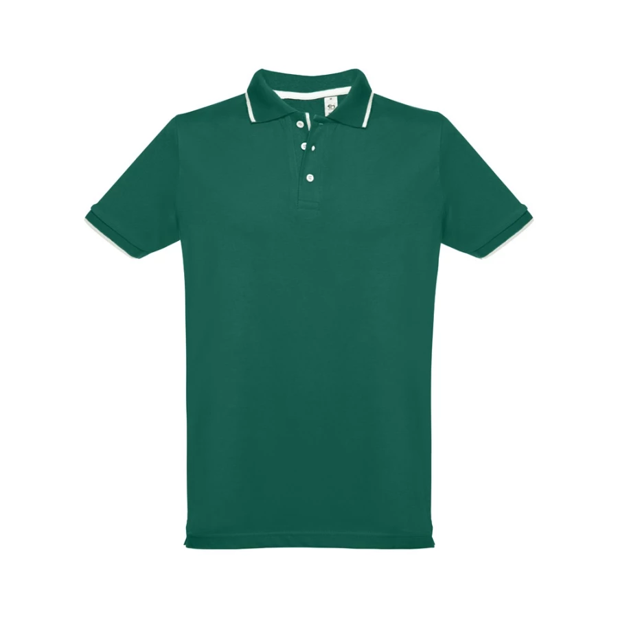 Męska dwukolorowa koszulka polo z krótkim rękawem, wykonana w 100% z bawełny zgrzebnej typu pique (210 g/m²) (kolor 183: 85% bawełna/15% wiskoza). Dwukolorowy kontrast na kołnierzu, rękawie i plisie. Posiada prążkowane mankiety i kołnierz. Wzmocniona plisa z 3 kontrastującymi kolorami guzików (dodatkowy guzik umieszczony w wewnętrznym szwie bocznym). Dopasowana talia i małe boczne rozcięcia na dole. Rozmiary: S, M, L, XL, XXL