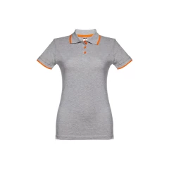 Damska dwukolorowa koszulka polo z krótkim rękawem, wykonana w 100% z bawełny zgrzebnej typu pique (210 g/m²) (kolor 183: 85% bawełna/15% wiskoza). Dwukolorowy kontrast na kołnierzu, rękawie i plisie. Posiada prążkowane mankiety i kołnierz. Wzmocniona plisa z 3 kontrastującymi kolorami guzików (dodatkowy guzik umieszczony w wewnętrznym szwie bocznym). Dopasowana talia i małe boczne rozcięcia na dole. Rozmiary: S, M, L, XL, XXL