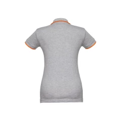 Damska dwukolorowa koszulka polo z krótkim rękawem, wykonana w 100% z bawełny zgrzebnej typu pique (210 g/m²) (kolor 183: 85% bawełna/15% wiskoza). Dwukolorowy kontrast na kołnierzu, rękawie i plisie. Posiada prążkowane mankiety i kołnierz. Wzmocniona plisa z 3 kontrastującymi kolorami guzików (dodatkowy guzik umieszczony w wewnętrznym szwie bocznym). Dopasowana talia i małe boczne rozcięcia na dole. Rozmiary: S, M, L, XL, XXL
