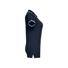 Damska dwukolorowa koszulka polo z krótkim rękawem, wykonana w 100% z bawełny zgrzebnej typu pique (210 g/m²) (kolor 183: 85% bawełna/15% wiskoza). Dwukolorowy kontrast na kołnierzu, rękawie i plisie. Posiada prążkowane mankiety i kołnierz. Wzmocniona plisa z 3 kontrastującymi kolorami guzików (dodatkowy guzik umieszczony w wewnętrznym szwie bocznym). Dopasowana talia i małe boczne rozcięcia na dole. Rozmiary: S, M, L, XL, XXL