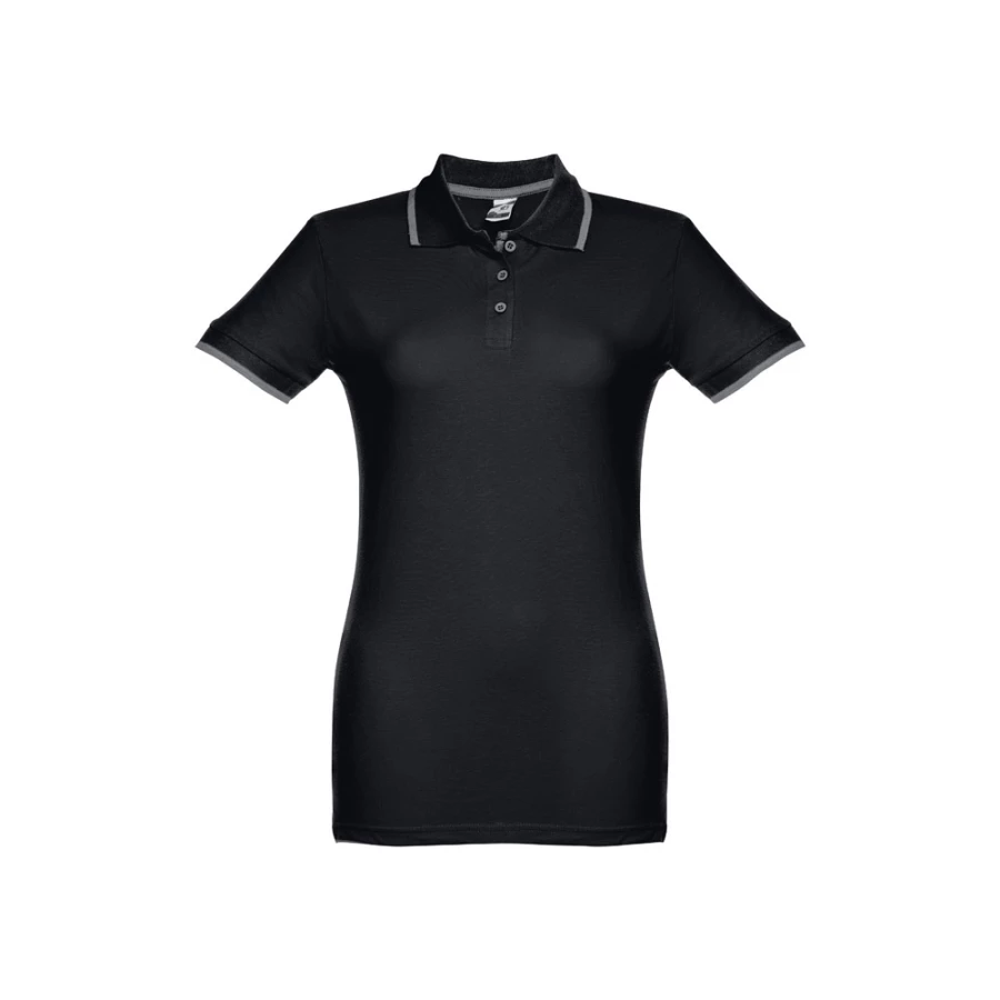 Damska dwukolorowa koszulka polo z krótkim rękawem, wykonana w 100% z bawełny zgrzebnej typu pique (210 g/m²) (kolor 183: 85% bawełna/15% wiskoza). Dwukolorowy kontrast na kołnierzu, rękawie i plisie. Posiada prążkowane mankiety i kołnierz. Wzmocniona plisa z 3 kontrastującymi kolorami guzików (dodatkowy guzik umieszczony w wewnętrznym szwie bocznym). Dopasowana talia i małe boczne rozcięcia na dole. Rozmiary: S, M, L, XL, XXL