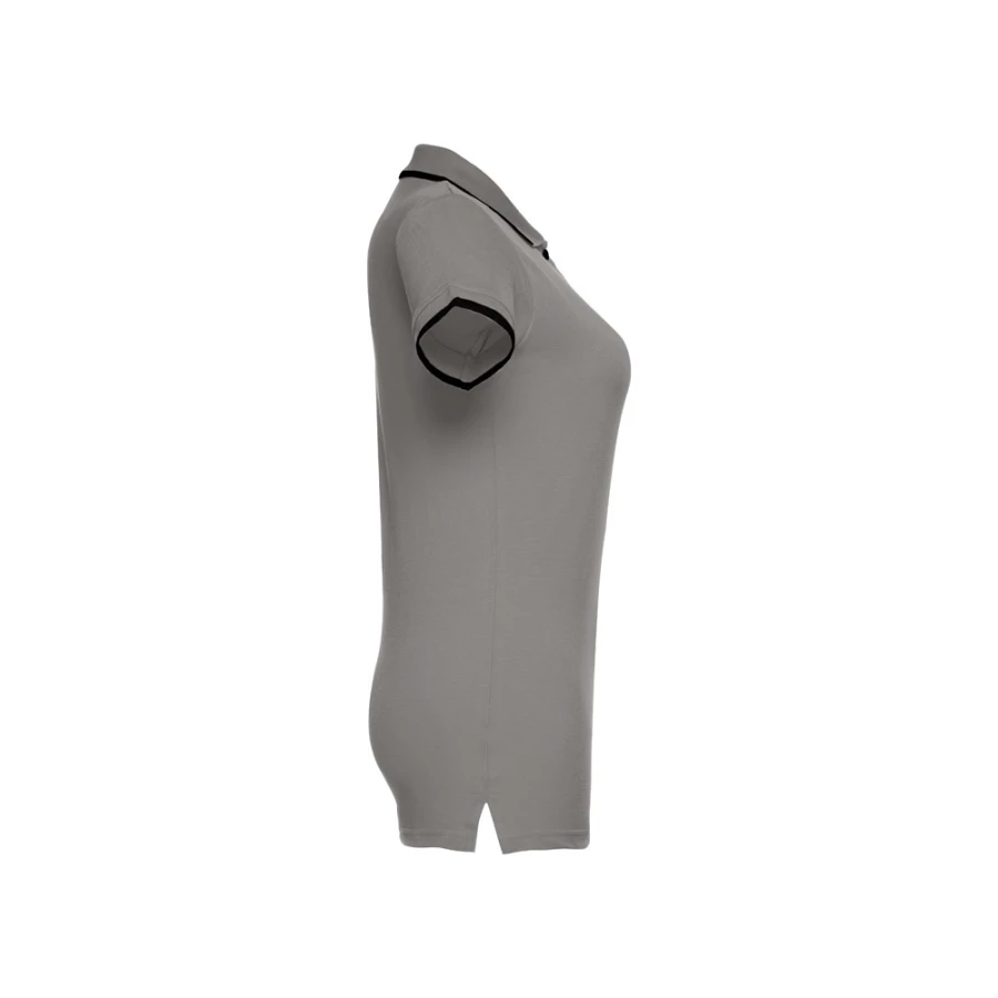 Damska dwukolorowa koszulka polo z krótkim rękawem, wykonana w 100% z bawełny zgrzebnej typu pique (210 g/m²) (kolor 183: 85% bawełna/15% wiskoza). Dwukolorowy kontrast na kołnierzu, rękawie i plisie. Posiada prążkowane mankiety i kołnierz. Wzmocniona plisa z 3 kontrastującymi kolorami guzików (dodatkowy guzik umieszczony w wewnętrznym szwie bocznym). Dopasowana talia i małe boczne rozcięcia na dole. Rozmiary: S, M, L, XL, XXL