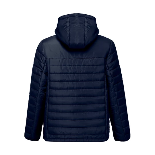 Męska kurtka z kapturem wykonana w 100% z recyklingowanego nylonu ripstop (350 g/m²) z wnętrzem wyściełanym w 100% recyklingowaną nylonową taftą (350 g/m²) dla większego komfortu noszenia. Kaptur jest ocieplany i ma różne funkcje: elastyczną taśmę, dwa guziki zatrzaskowe i zamek błyskawiczny umożliwiający jego odpinanie. Z przodu zamek błyskawiczny YKK® - marki, która korzysta z nowoczesnego sprzętu o wysokiej jakości - i ściągacz. Posiada dwie przednie kieszenie z zamkami błyskawicznymi i ściągaczami oraz dwie wewnętrzne kieszenie z samoprzylepnymi zamkami błyskawicznymi. W dolnej części pleców znajduje się zapinany na zamek dostęp ułatwiający personalizację. Rozmiary: S, M, L, XL, XXL, 3XL
