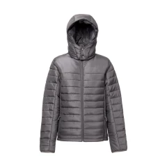 Damska kurtka z kapturem wykonana w 100% z nylonu ripstop z recyklingu (350 g/m²), wewnątrz podszyta w 100% nylonową taftą z recyklingu (350 g/m²) dla większego komfortu noszenia. Kaptur jest wyściełany i ma różne funkcje: elastyczną taśmę, dwa guziki zatrzaskowe i zamek błyskawiczny umożliwiający jego odpinanie. Z przodu zamek błyskawiczny YKK® - marki, która korzysta z nowoczesnego sprzętu o wysokiej jakości - i ściągacz. Posiada dwie przednie kieszenie z zamkami błyskawicznymi i ściągaczami oraz dwie wewnętrzne kieszenie z samoprzylepnymi zamkami błyskawicznymi. W dolnej części pleców znajduje się zapinany na zamek dostęp ułatwiający personalizację. Rozmiary: XS, S, M, L, XL, XXL