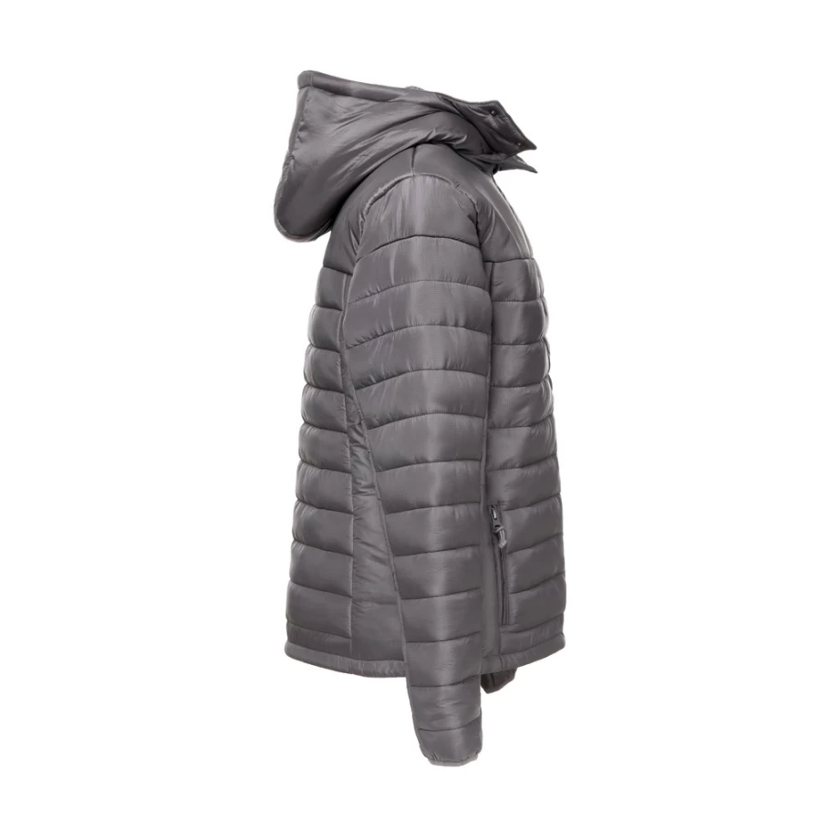 Damska kurtka z kapturem wykonana w 100% z nylonu ripstop z recyklingu (350 g/m²), wewnątrz podszyta w 100% nylonową taftą z recyklingu (350 g/m²) dla większego komfortu noszenia. Kaptur jest wyściełany i ma różne funkcje: elastyczną taśmę, dwa guziki zatrzaskowe i zamek błyskawiczny umożliwiający jego odpinanie. Z przodu zamek błyskawiczny YKK® - marki, która korzysta z nowoczesnego sprzętu o wysokiej jakości - i ściągacz. Posiada dwie przednie kieszenie z zamkami błyskawicznymi i ściągaczami oraz dwie wewnętrzne kieszenie z samoprzylepnymi zamkami błyskawicznymi. W dolnej części pleców znajduje się zapinany na zamek dostęp ułatwiający personalizację. Rozmiary: XS, S, M, L, XL, XXL