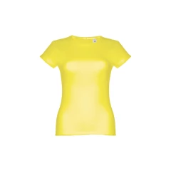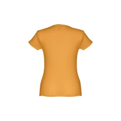 T-shirt damski o dopasowanym kroju ze 100% bawełnianego jerseyu (150 g/m²) z przędzą bawełnianą (kolor 183: 90% bawełna/10% wiskoza). Ma cienki kołnierz z podwójnej dzianiny wzmocniony satynową taśmą lamówką. Skrojona i zszyta odzież z podwójnym szwem na rękawach i u dołu. Rozmiar: 3XL