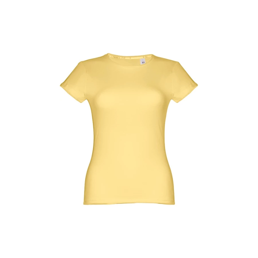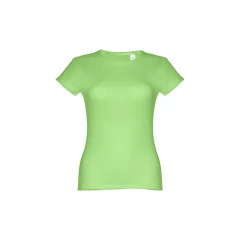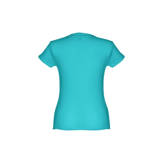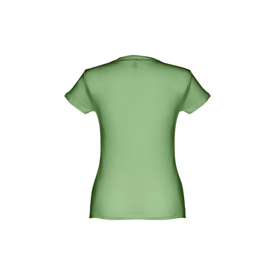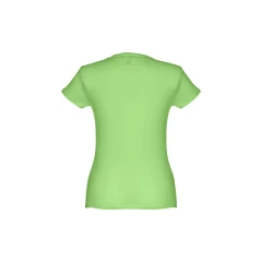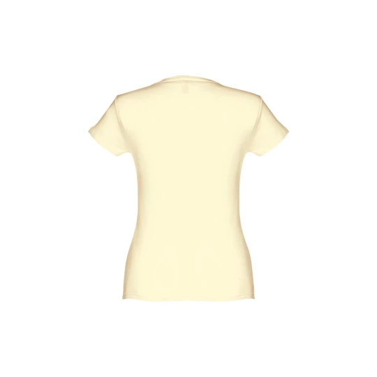 T-shirt damski o dopasowanym kroju ze 100% bawełnianego jerseyu (150 g/m²) z przędzą bawełnianą (kolor 183: 90% bawełna/10% wiskoza). Ma cienki kołnierz z podwójnej dzianiny wzmocniony satynową taśmą lamówką. Skrojona i zszyta odzież z podwójnym szwem na rękawach i u dołu. Rozmiar: 3XL