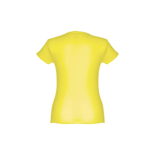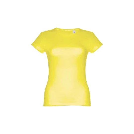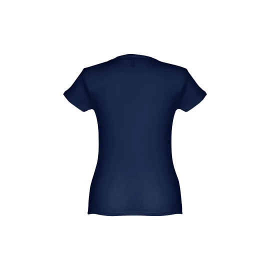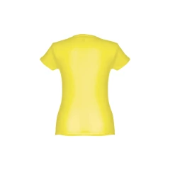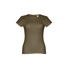 T-shirt damski o dopasowanym kroju ze 100% bawełnianego jerseyu (150 g/m²) z przędzą bawełnianą (kolor 183: 90% bawełna/10% wiskoza). Ma cienki kołnierz z podwójnej dzianiny wzmocniony satynową taśmą lamówką. Skrojona i zszyta odzież z podwójnym szwem na rękawach i u dołu. Rozmiar: 3XL