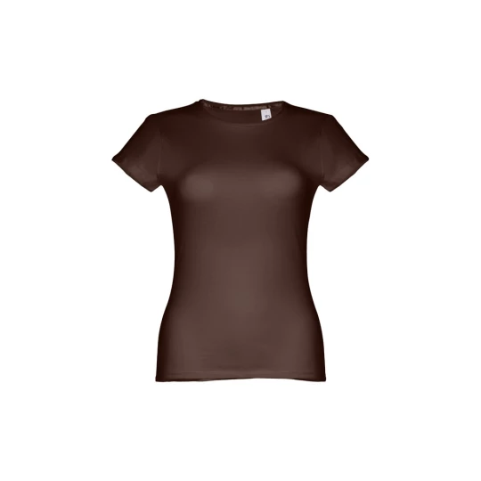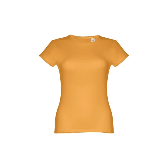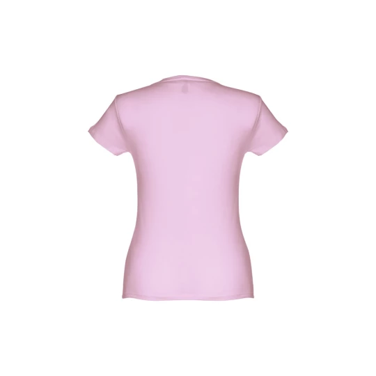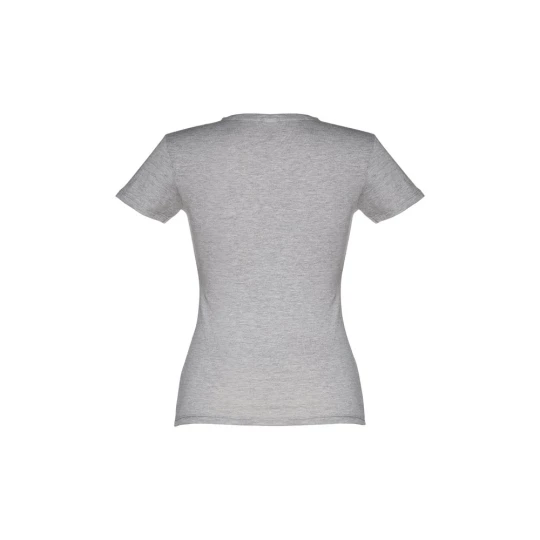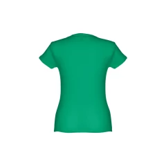 T-shirt damski o dopasowanym kroju ze 100% bawełnianego jerseyu (150 g/m²) z przędzą bawełnianą (kolor 183: 90% bawełna/10% wiskoza). Ma cienki kołnierz z podwójnej dzianiny wzmocniony satynową taśmą lamówką. Skrojona i zszyta odzież z podwójnym szwem na rękawach i u dołu. Rozmiar: 3XL
