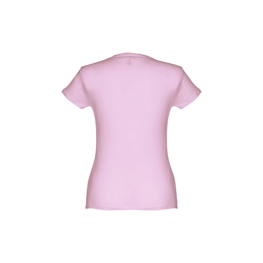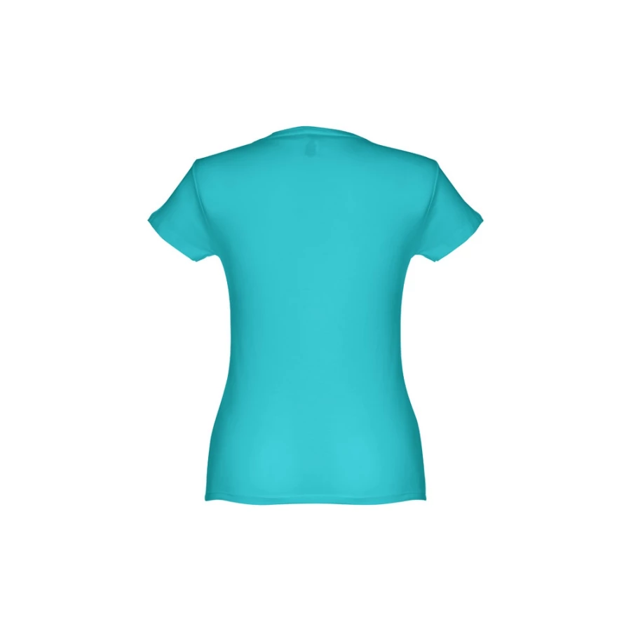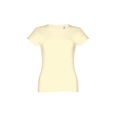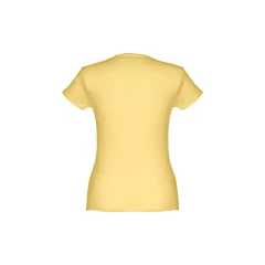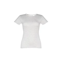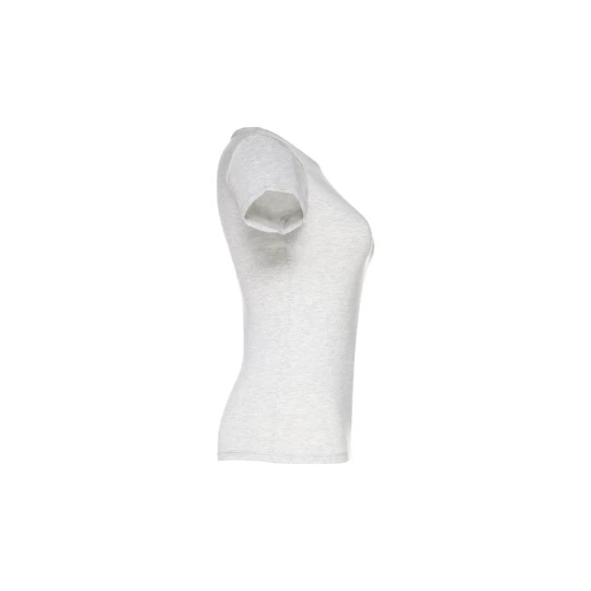 T-shirt damski o dopasowanym kroju ze 100% bawełnianego jerseyu (150 g/m²) z przędzą bawełnianą (kolor 183: 90% bawełna/10% wiskoza). Ma cienki kołnierz z podwójnej dzianiny wzmocniony satynową taśmą lamówką. Skrojona i zszyta odzież z podwójnym szwem na rękawach i u dołu. Rozmiar: 3XL