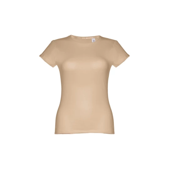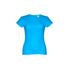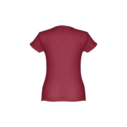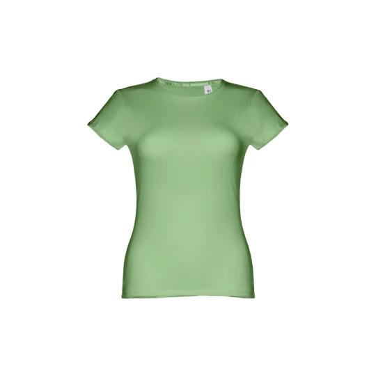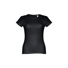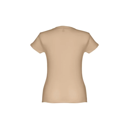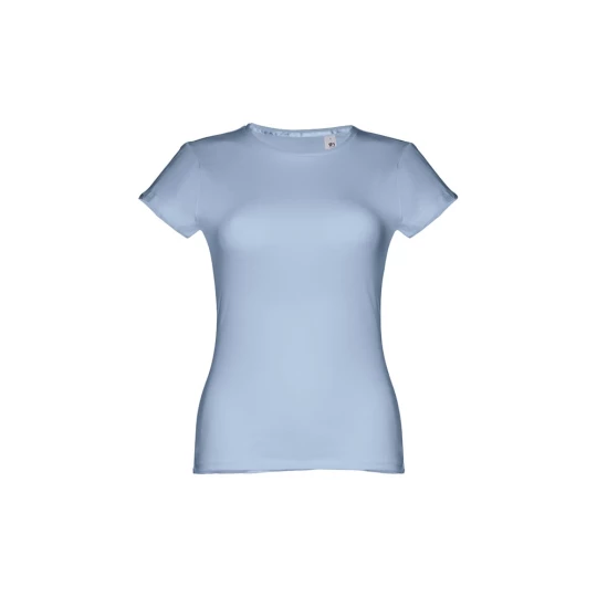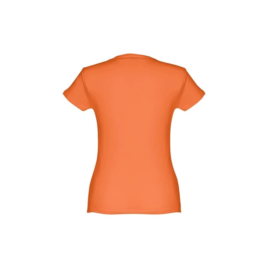 T-shirt damski o dopasowanym kroju ze 100% bawełnianej dzianiny jersey (150 g/m²) ze zgrzebną przędzą bawełnianą (kolor 183: 90% bawełna/10% wiskoza, kolor 196: 98% bawełna/2% wiskoza). Posiada cienki podwójny kołnierz z dżerseju wzmocniony satynową taśmą skośną. Skrojony i zszyty, z podwójnym szwem na rękawach i u dołu. Rozmiary: S, M, L, XL, XXL