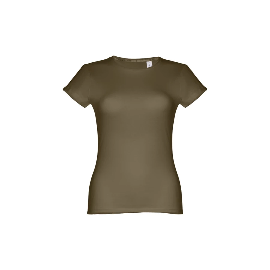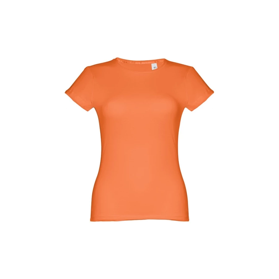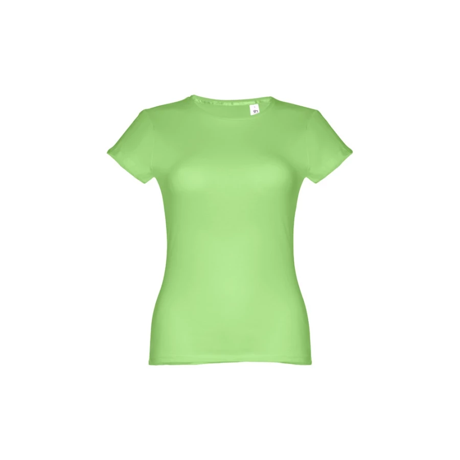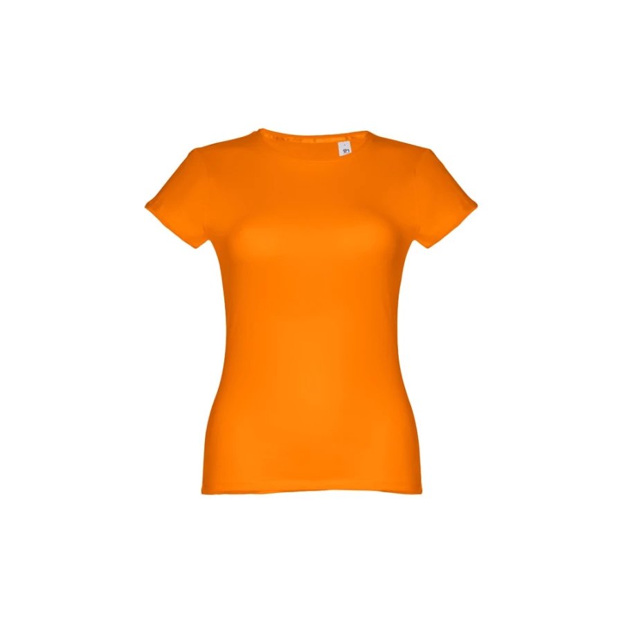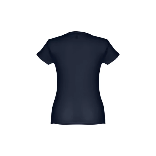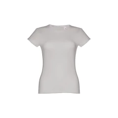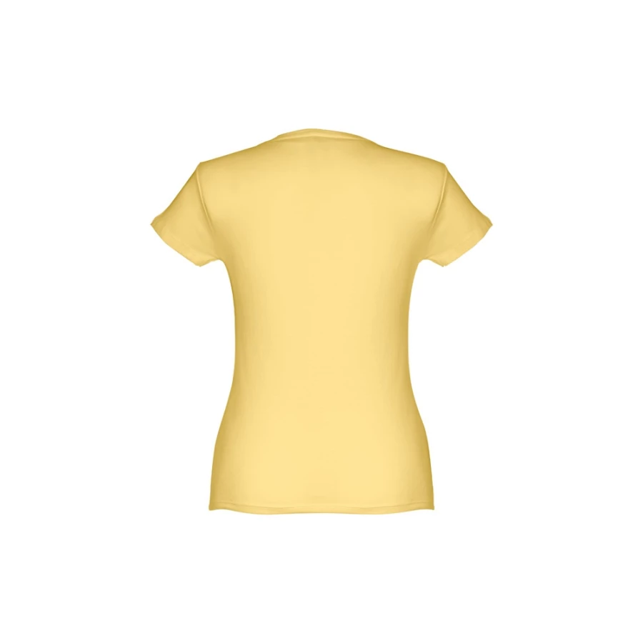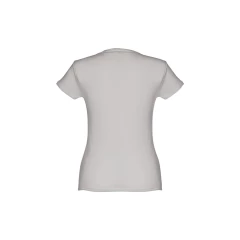 T-shirt damski o dopasowanym kroju ze 100% bawełnianej dzianiny jersey (150 g/m²) ze zgrzebną przędzą bawełnianą (kolor 183: 90% bawełna/10% wiskoza, kolor 196: 98% bawełna/2% wiskoza). Posiada cienki podwójny kołnierz z dżerseju wzmocniony satynową taśmą skośną. Skrojony i zszyty, z podwójnym szwem na rękawach i u dołu. Rozmiary: S, M, L, XL, XXL