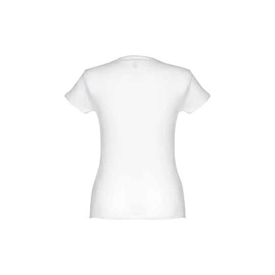 T-shirt damski o dopasowanym kroju ze 100% bawełnianej dzianiny jersey (150 g/m²) z przędzą bawełnianą. Posiada cienki podwójny kołnierz z dżerseju wzmocniony satynową taśmą skośną. Skrojony i zszyty, z podwójnym szwem na rękawach i u dołu. Rozmiary: S, M, L, XL, XXL