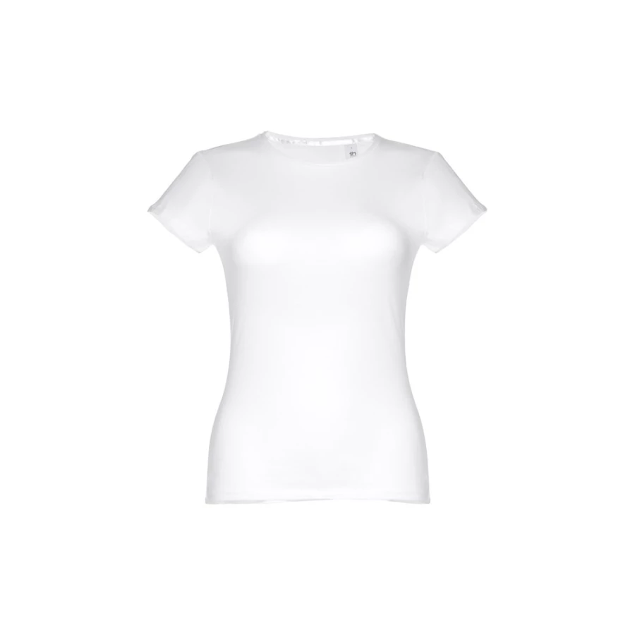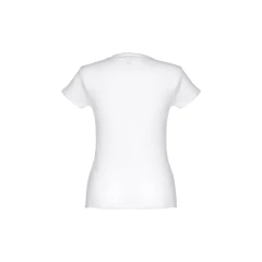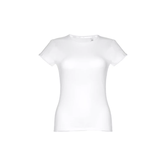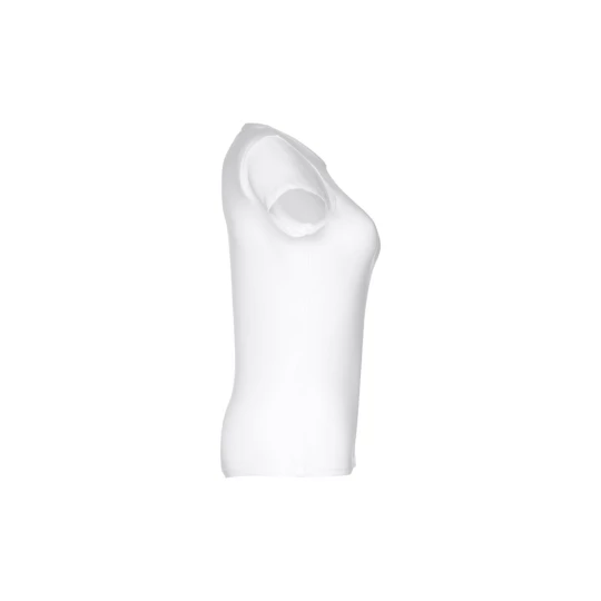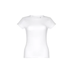 T-shirt damski o dopasowanym kroju ze 100% bawełnianej dzianiny jersey (150 g/m²) z przędzą bawełnianą. Posiada cienki podwójny kołnierz z dżerseju wzmocniony satynową taśmą skośną. Skrojony i zszyty, z podwójnym szwem na rękawach i u dołu. Rozmiary: S, M, L, XL, XXL