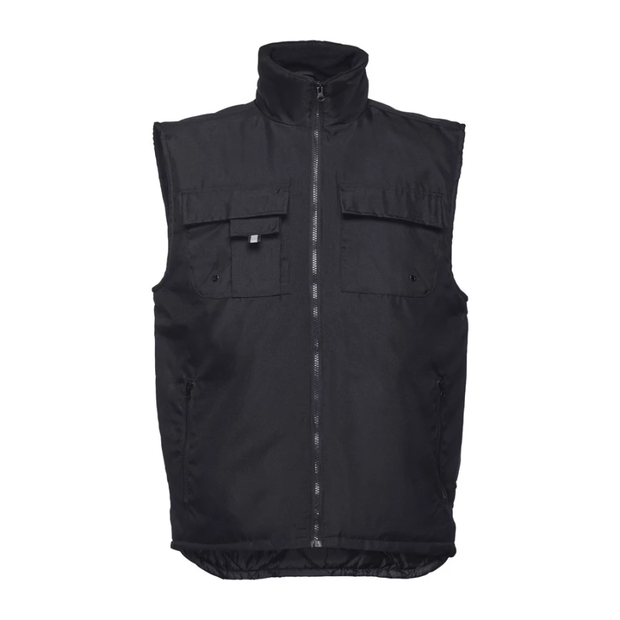 Wyściełana męska kamizelka robocza ze 100% poliestru oxford z powłoką akrylową (170 g/m²), podszewka w 100% z poliestru z tafty (65 g/m²). Kołnierz podszyty polarem i elastyczne boki dla lepszego dopasowania. Zawiera 6 kieszeni: 5 przednich, w tym 2 z wewnętrznym zamkiem, 1 na telefon komórkowy i 1 wewnętrzną. Zapięcie na zamek z tyłu dla łatwej personalizacji. Rozmiary: S, M, L, XL, XXL, 3XL