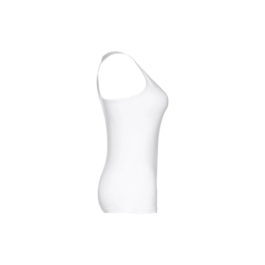 Damska koszulka bez rękawów ze 100% bawełnianej dzianiny jersey (160 g/m²) ze zgrzebną przędzą bawełnianą. Okrągły kołnierz i tył w kształcie litery „T”. Skrojona i uszyta odzież z podwójnym szyciem i skośnym wykrojem na ręce oraz przy dekolcie. Rozmiary: S, M, L, XL, XXL