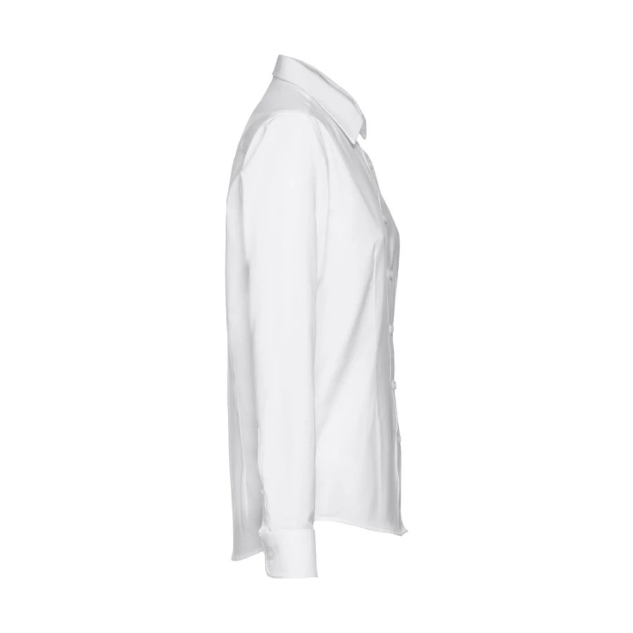 Damska koszula oxford z długimi rękawami, wykonana w 70% z bawełny i 30% z poliestru (130 g/m²). Ma regulowane mankiety z 2 guzikami i zakładką. Dopasowana koszula z 2 zaszewkami z przodu i z tyłu. Zapinana na 7 guzików w kolorze perłowym. Rozmiary: S, M, L, XL, XXL