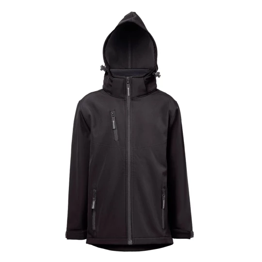 Kurtka dziecięca wykonana w 96% z poliestru softshell pochodzącego z recyklingu i w 4% z elastanu (280 g/m²), z dwoma sznurkami i wodoodporną podszewką. Kurtka z polarową podszewką (100% poliester z recyklingu) z 2 przednimi kieszeniami i ukośną kieszenią na piersi, obie zapinane na zamek. Odpinany i regulowany kaptur ze sznurkiem ściągającym i samoprzylepnym paskiem na suwak do dopasowania do kołnierza. Zapięcie z przodu na zamek błyskawiczny YKK® - marki, która korzysta z nowoczesnego sprzętu i wysokiej jakości kontroli. Regulowane ściągacze rękawów z samoprzylepnym paskiem. Zaokrąglona dolna część pleców. Rozmiary: 4, 6, 8, 10, 12