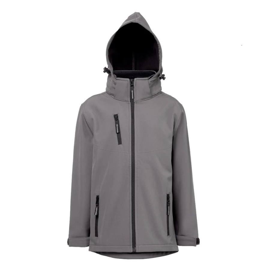 Kurtka dziecięca wykonana w 96% z poliestru softshell pochodzącego z recyklingu i w 4% z elastanu (280 g/m²), z dwoma sznurkami i wodoodporną podszewką. Kurtka z polarową podszewką (100% poliester z recyklingu) z 2 przednimi kieszeniami i ukośną kieszenią na piersi, obie zapinane na zamek. Odpinany i regulowany kaptur ze sznurkiem ściągającym i samoprzylepnym paskiem na suwak do dopasowania do kołnierza. Zapięcie z przodu na zamek błyskawiczny YKK® - marki, która korzysta z nowoczesnego sprzętu i wysokiej jakości kontroli. Regulowane ściągacze rękawów z samoprzylepnym paskiem. Zaokrąglona dolna część pleców. Rozmiary: 4, 6, 8, 10, 12