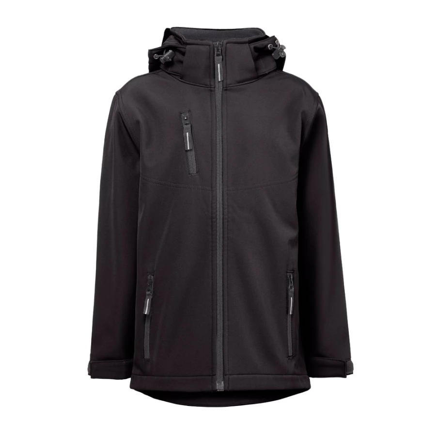 Kurtka dziecięca wykonana w 96% z poliestru softshell pochodzącego z recyklingu i w 4% z elastanu (280 g/m²), z dwoma sznurkami i wodoodporną podszewką. Kurtka z polarową podszewką (100% poliester z recyklingu) z 2 przednimi kieszeniami i ukośną kieszenią na piersi, obie zapinane na zamek. Odpinany i regulowany kaptur ze sznurkiem ściągającym i samoprzylepnym paskiem na suwak do dopasowania do kołnierza. Zapięcie z przodu na zamek błyskawiczny YKK® - marki, która korzysta z nowoczesnego sprzętu i wysokiej jakości kontroli. Regulowane ściągacze rękawów z samoprzylepnym paskiem. Zaokrąglona dolna część pleców. Rozmiary: 4, 6, 8, 10, 12