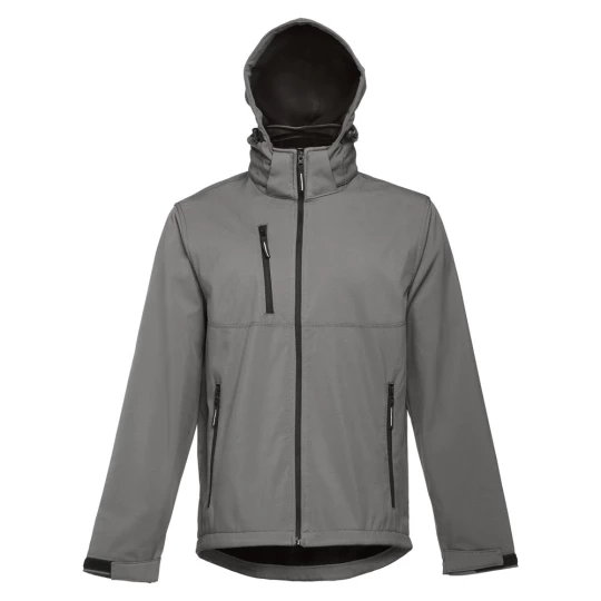 Męska kurtka softshell z 96% poliestru i 4% elastanu (280 g/m²), z dwiema warstwami, odpinanym kapturem i wodoodporną powłoką. Kurtka z polarową podszewką z 2 przednimi kieszeniami i ukośną kieszenią na piersi, wszystkie z zamkami. Regulowane mankiety o przylegającym zapięciu. Odpinany kaptur ze sznurkiem i paskiem o przylegającym zapięciu do mocowania przy kołnierzu. Kurtka ma zaokrgąglony dolny brzeg. Rozmiary: S, M, L, XL, XXL