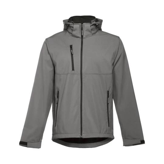 Męska kurtka softshell z 96% poliestru i 4% elastanu (280 g/m²), z dwiema warstwami, odpinanym kapturem i wodoodporną powłoką. Kurtka z polarową podszewką z 2 przednimi kieszeniami i ukośną kieszenią na piersi, wszystkie z zamkami. Regulowane mankiety o przylegającym zapięciu. Odpinany kaptur ze sznurkiem i paskiem o przylegającym zapięciu do mocowania przy kołnierzu. Kurtka ma zaokrgąglony dolny brzeg. Rozmiary: S, M, L, XL, XXL