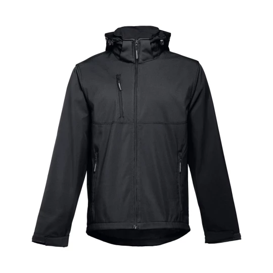 Męska kurtka softshell z 96% poliestru i 4% elastanu (280 g/m²), z dwiema warstwami, odpinanym kapturem i wodoodporną powłoką. Kurtka z polarową podszewką z 2 przednimi kieszeniami i ukośną kieszenią na piersi, wszystkie z zamkami. Regulowane mankiety o przylegającym zapięciu. Odpinany kaptur ze sznurkiem i paskiem o przylegającym zapięciu do mocowania przy kołnierzu. Kurtka ma zaokrgąglony dolny brzeg. Rozmiary: S, M, L, XL, XXL