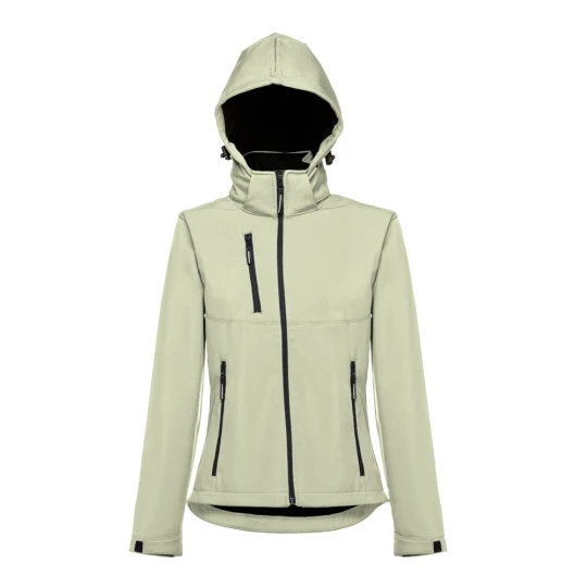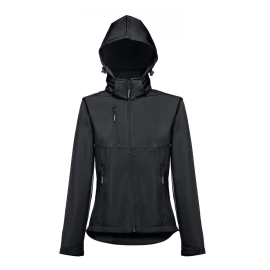 Damska kamizelka typu softshell z 96% poliestru i 4% elastanu (280 g/m²), z dwiema warstwami, odpinanym kapturem i wodoodporną powłoką. Kurtka z podszewką z 2 przednimi kieszeniami i ukośną kieszenią na piersi, wszystkie z zamkami. Regulowane mankiety o przylegającym zapięciu. Odpinany kaptur ze sznurkiem i paskiem o przylegającym zapięciu do mocowania przy kołnierzu. Kurtka ma zaokrąglony dolny brzeg. Rozmiary: S, M, L, XL, XXL