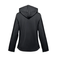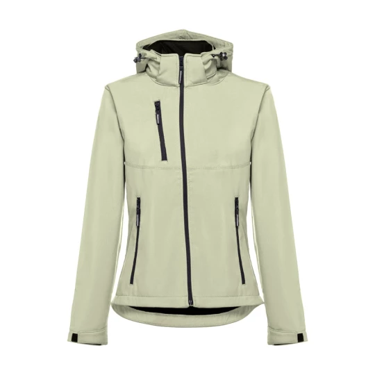 Damska kamizelka typu softshell z 96% poliestru i 4% elastanu (280 g/m²), z dwiema warstwami, odpinanym kapturem i wodoodporną powłoką. Kurtka z podszewką z 2 przednimi kieszeniami i ukośną kieszenią na piersi, wszystkie z zamkami. Regulowane mankiety o przylegającym zapięciu. Odpinany kaptur ze sznurkiem i paskiem o przylegającym zapięciu do mocowania przy kołnierzu. Kurtka ma zaokrąglony dolny brzeg. Rozmiary: S, M, L, XL, XXL