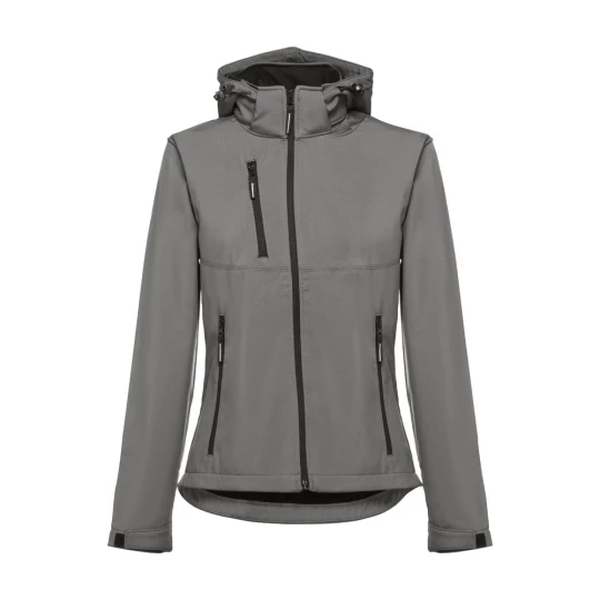 Damska kamizelka typu softshell z 96% poliestru i 4% elastanu (280 g/m²), z dwiema warstwami, odpinanym kapturem i wodoodporną powłoką. Kurtka z podszewką z 2 przednimi kieszeniami i ukośną kieszenią na piersi, wszystkie z zamkami. Regulowane mankiety o przylegającym zapięciu. Odpinany kaptur ze sznurkiem i paskiem o przylegającym zapięciu do mocowania przy kołnierzu. Kurtka ma zaokrąglony dolny brzeg. Rozmiary: S, M, L, XL, XXL
