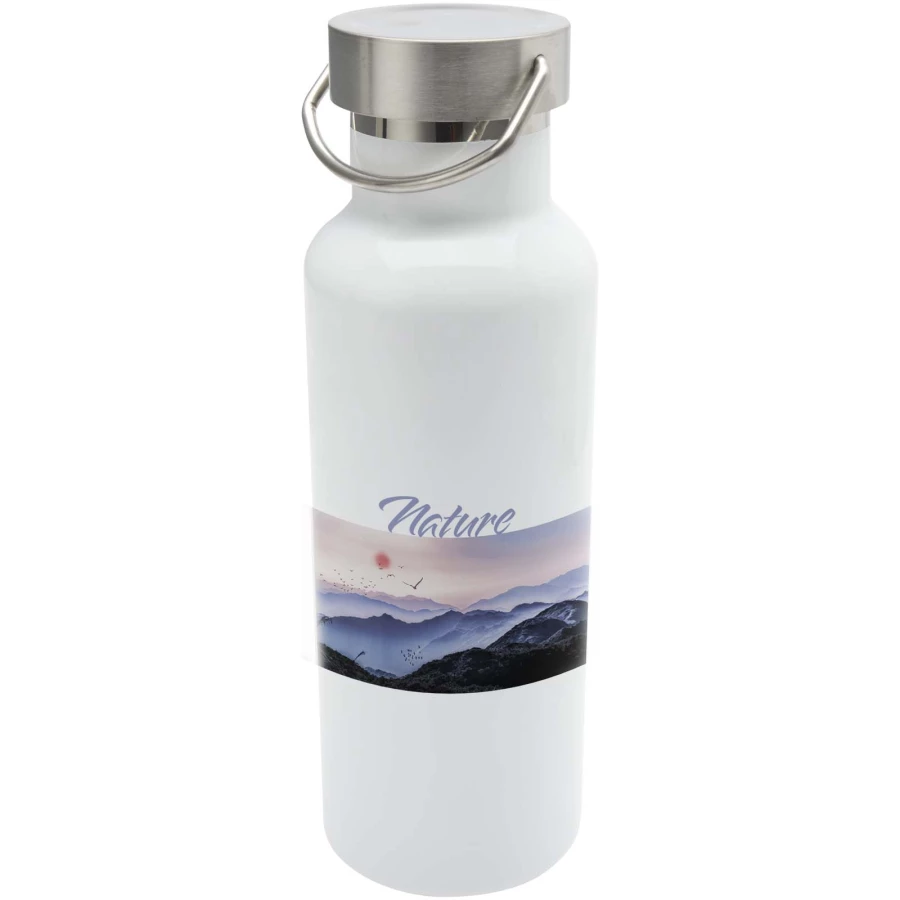 Ta butelka na wodę, wykonana z wytrzymałej, dwuściennej, izolowanej próżniowo stali nierdzewnej z certyfikatem RCS, została zaprojektowana tak, aby dłużej utrzymywać napoje w pożądanej temperaturze. Specjalna powłoka zewnętrzna umożliwia wykonywanie nadruków sublimacyjnych, a produkt wyposażony jest w zakręcaną pokrywkę ze stali nierdzewnej z mocnym uchwytem ułatwiającym przenoszenie. Pojemność: 500 ml. Szczelne. Zapakowane w pudełko podarunkowe.