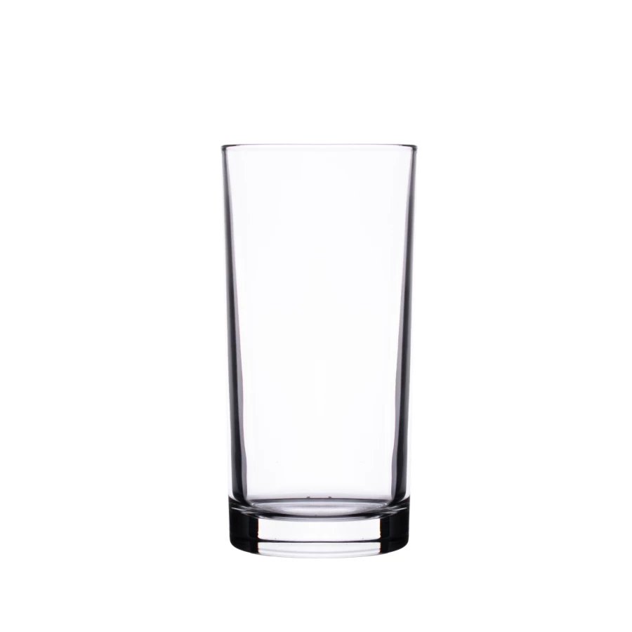 Smukła szklanka o wysokich prostych ściankach. Posiada gruby, stabilizujący spód. Wykonana ze szkła pochodzenia europejskiego.