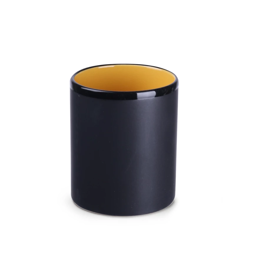 Czarna matowa wersja popularnego modelu o prostych ściankach i cylindrycznym kształcie. Posiada kilka kolorów wnętrza do wyboru oraz kontrastowe wykończenie błyszczącym paskiem, które dodatkowo podkreślą naniesiony na niego wyjątkowy branding.