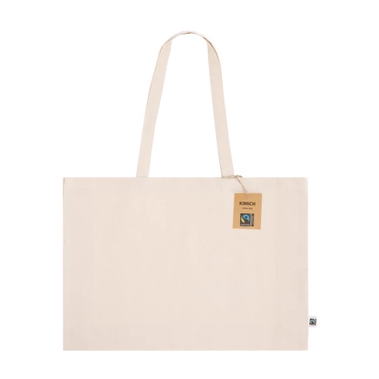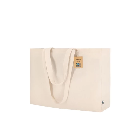 Torba na zakupy, posiada długie uchwyty umożliwiające noszenie na ramieniu, produkt wykonany z bawełny o gramaturze 220 g/m², zgodny z certyfikatem FAIRTRADE