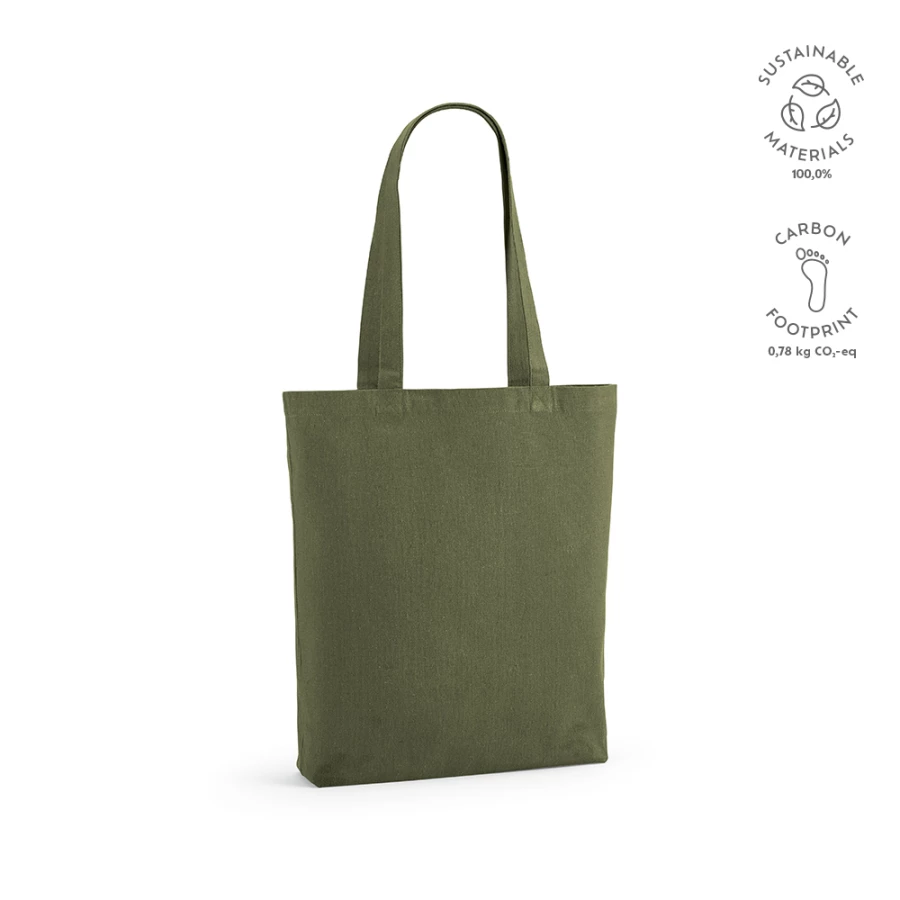 Ta torba wielokrotnego użytku (15L) jest wykonana w 70% z bawełny pochodzącej z recyklingu i w 30% z rPET. Łatwa do przenoszenia dzięki wygodnym uchwytom o długości 65 cm. Jest to zrównoważony i przyjazny dla środowiska wybór, zmniejszający ilość odpadów i promujący odpowiedzialność za środowisko.