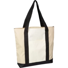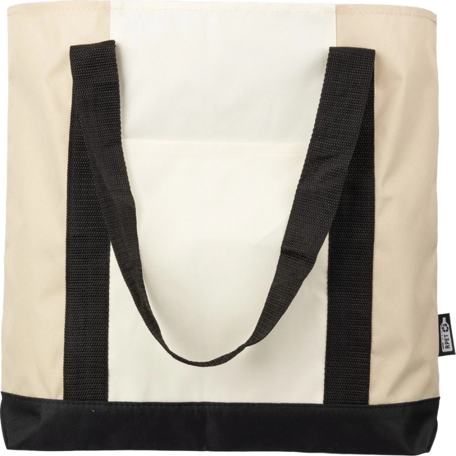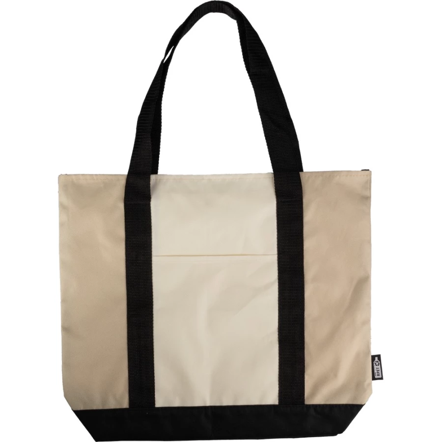 Torba na zakupy, posiada długie uchwyty umożliwiające noszenie na ramieniu, duża przegroda zapinana na zamek, otwarta kieszeń przednia, produkt wykonany z RPET
