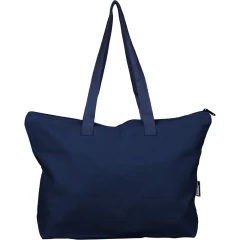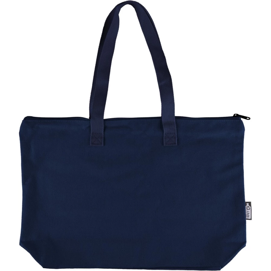Torba na zakupy 330 g/m², duża kieszeń zapinana na zamek, posiada długie uchwyty umożliwiające noszenie na ramieniu (65 x 2,5cm), ikona RPET na metce, produkt wykonany z polibawełny z recyklingu, poliestru i RPET