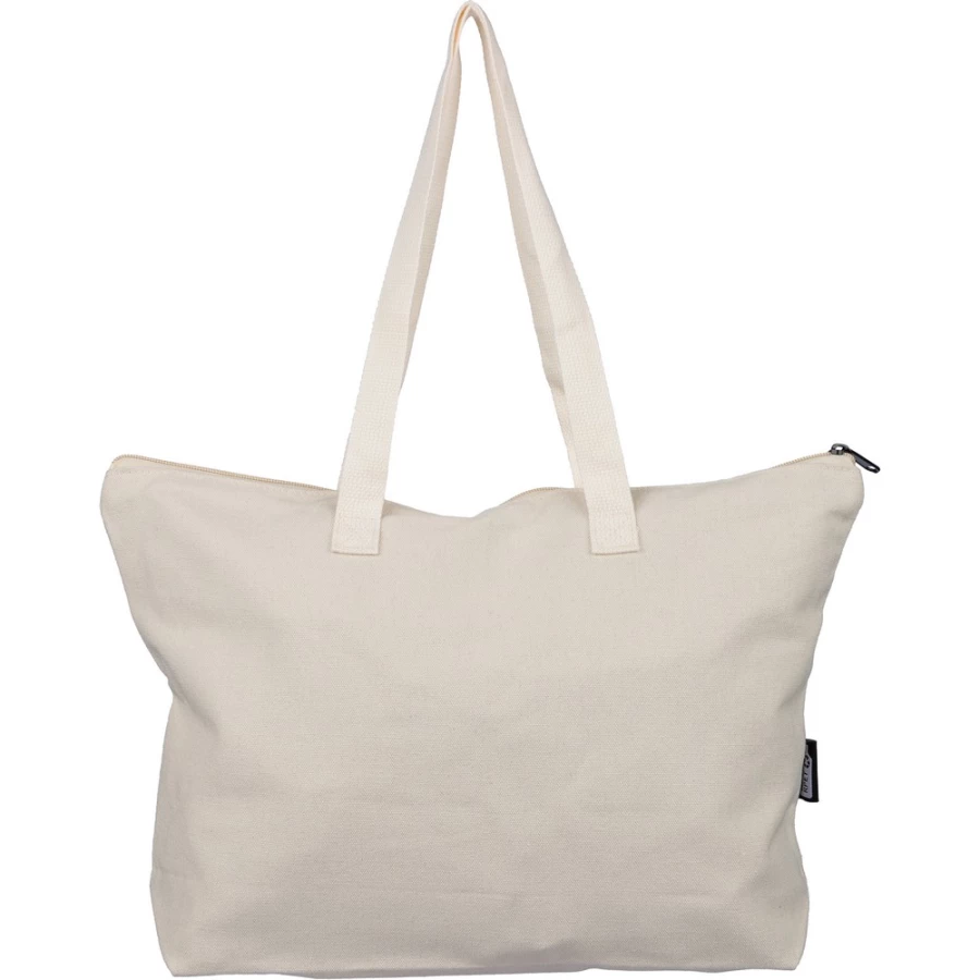 Torba na zakupy 330 g/m², duża kieszeń zapinana na zamek, posiada długie uchwyty umożliwiające noszenie na ramieniu (65 x 2,5cm), ikona RPET na metce, produkt wykonany z polibawełny z recyklingu, poliestru i RPET