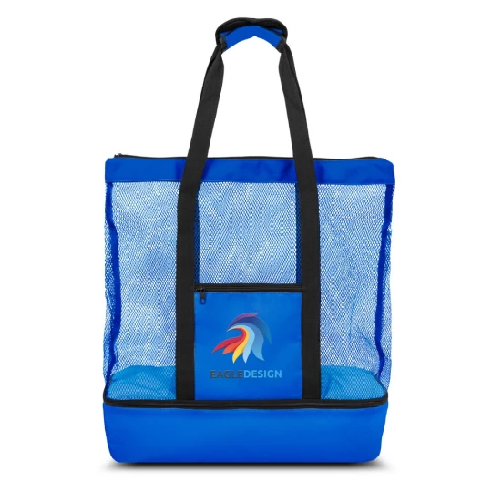 Torba plażowa, na zakupy, wykonana z poliestru RPET, zgodna z certyfikatem GRS (Global RecycIed Standard), z dolną przegrodą termoizolacyjną na zamek błyskawiczny, przednia kieszeń i siateczkowa przegroda główna na zamek błyskawiczny
