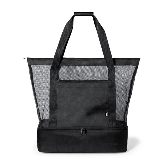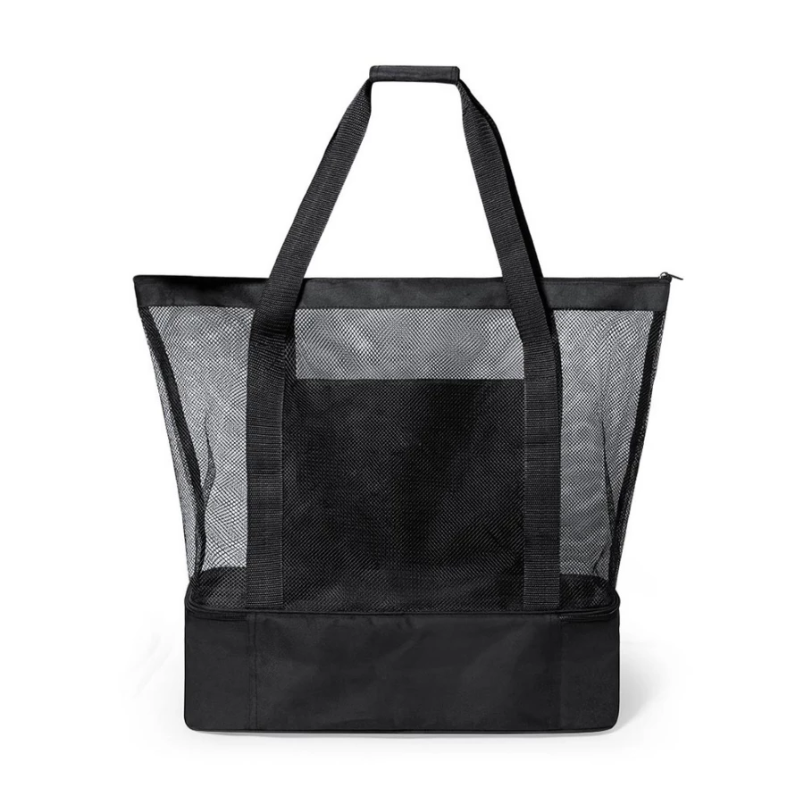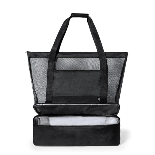 Torba plażowa, na zakupy, wykonana z poliestru RPET, z dolną przegrodą termoizolacyjną na zamek błyskawiczny, przednia kieszeń i siateczkowa przegroda główna na zamek błyskawiczny