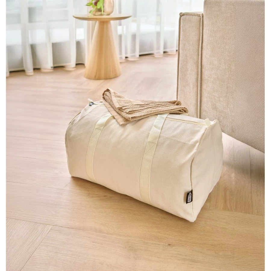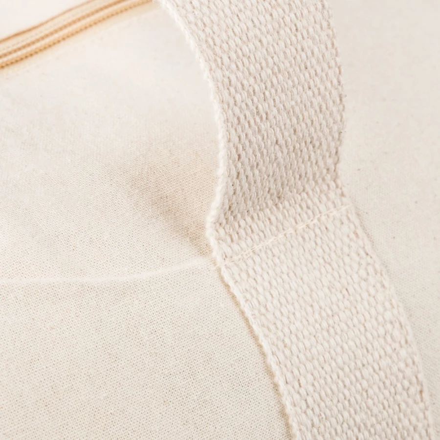 Torba podróżna 180 g/m², posiada długie uchwyty umożliwiające noszenie na ramieniu (5 x 60 cm), ikona OEKO-TEX na metce, produkt wykonany z bawełny naturalnej