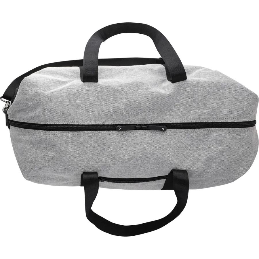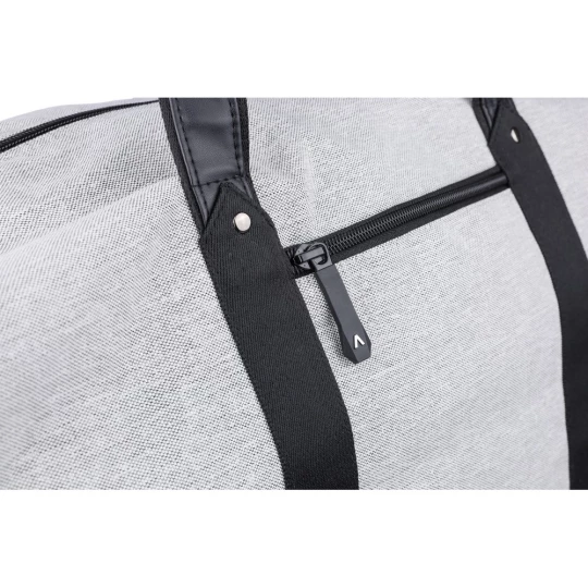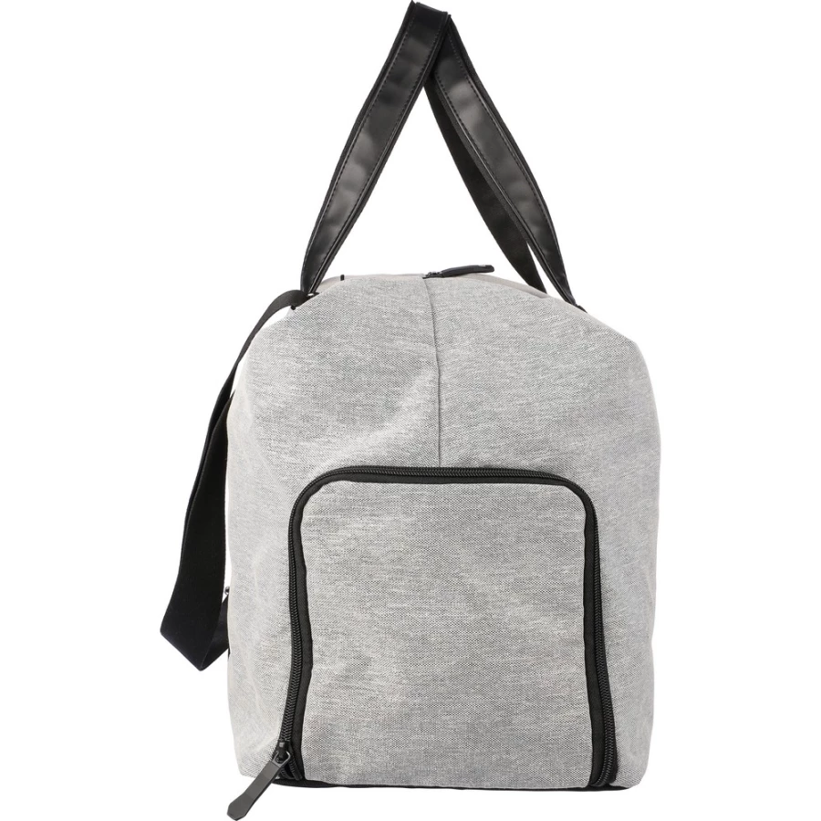 Torba sportowa, podróżna z podszewką, wewnątrz znajduje się pianka i płyta PE o grubości 1 mm, mała przednia komora zapinana na zamek, duża komora zapinana na zamek, kieszeń na buty z boku, regulowany pasek na ramię, dwa duże uchwyty do noszenia w dłoni, produkt wykonany z RPET, poliestru i PU